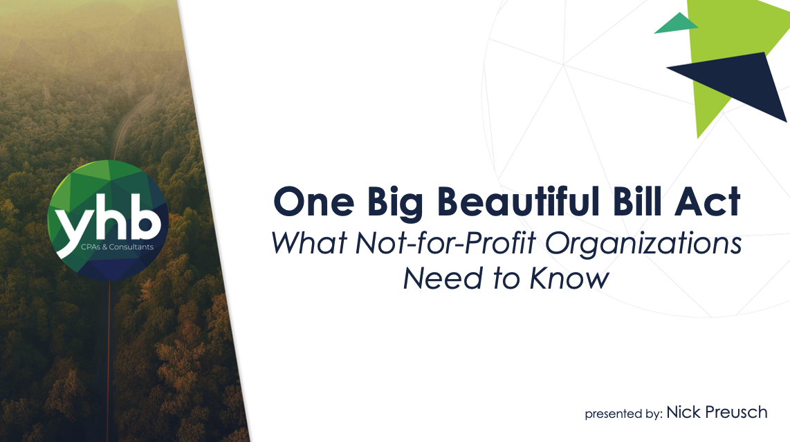 The recently enacted One Big Beautiful Bill introduces sweeping changes that will directly impact the not-for-profit sector. From compliance requirements and reporting obligations to strategic financial planning, these updates carry significant implications for boards, executives, and finance teams. Join YHB as we break down the bill’s key provisions, outline what organizations need to do to stay compliant, and share insights on how these changes may affect funding, operations, and long-term sustainability. This session will provide practical guidance and actionable takeaways to help your organization adapt with confidence.
