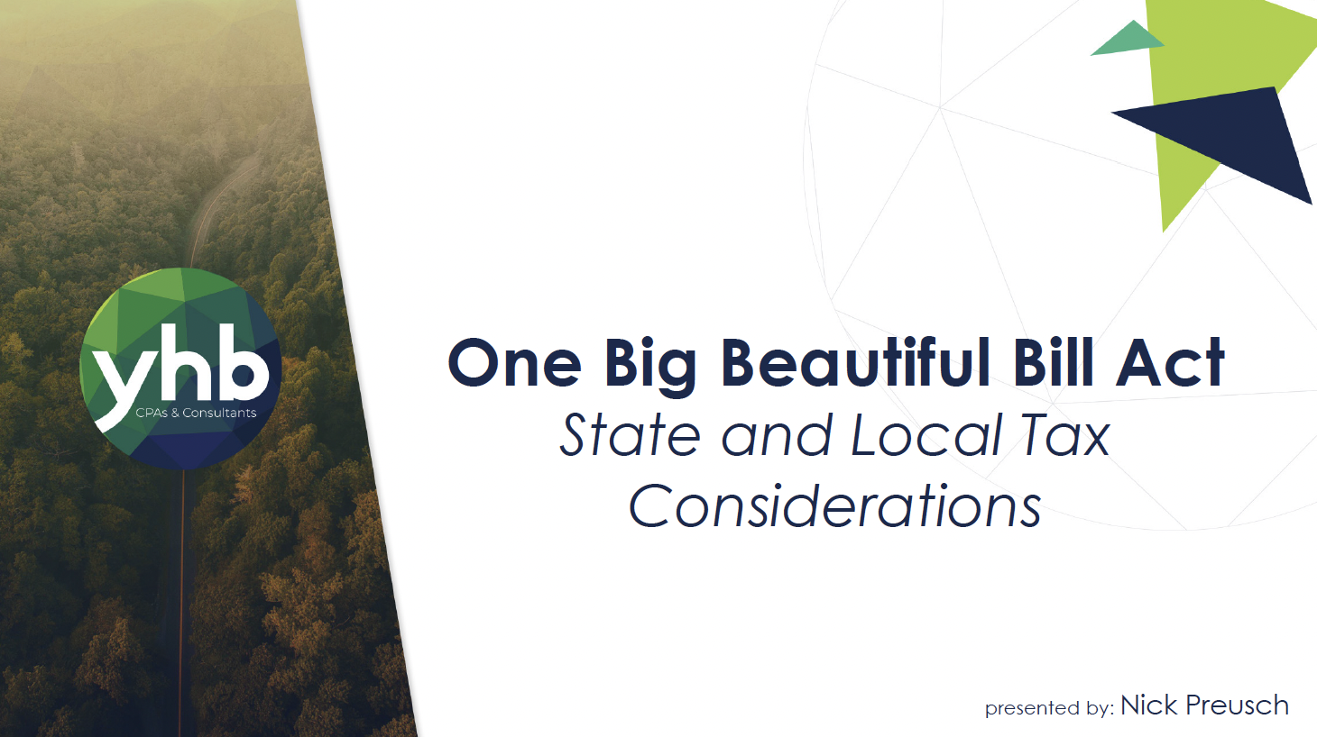 Pass-through entities face complex new challenges under the One Big Beautiful Bill, particularly when it comes to state and local tax (SALT) considerations. From revised deduction limitations to entity-level tax elections, the bill reshapes how owners and advisors should plan at the state level. Join YHB’s SALT team as we break down the key state tax provisions, share insights into how pass-through entities may be impacted, and outline strategies to minimize risks while maximizing tax efficiency. This session is designed for business owners, CFOs, and tax professionals working with partnerships, S corporations, and other pass-through entities.